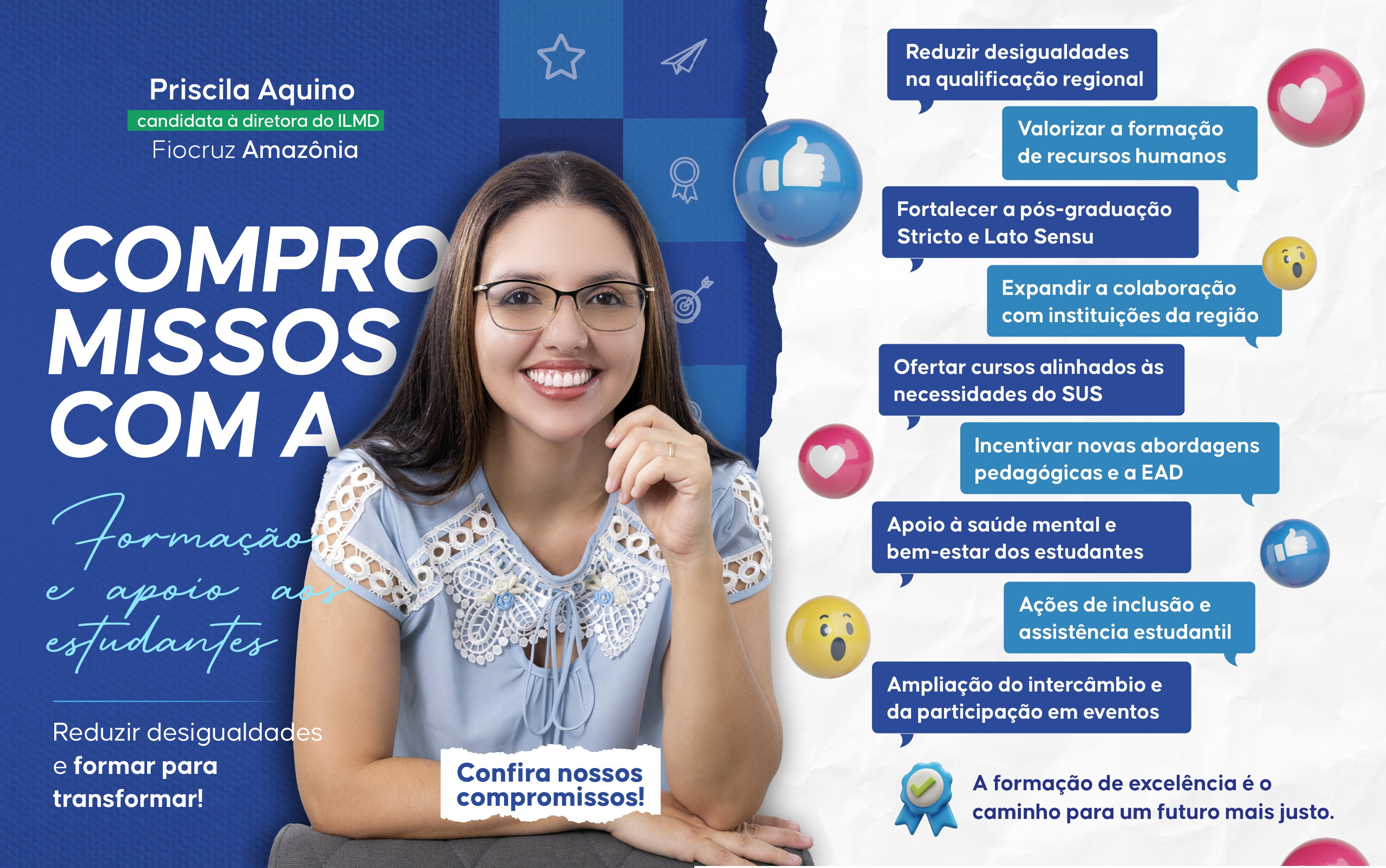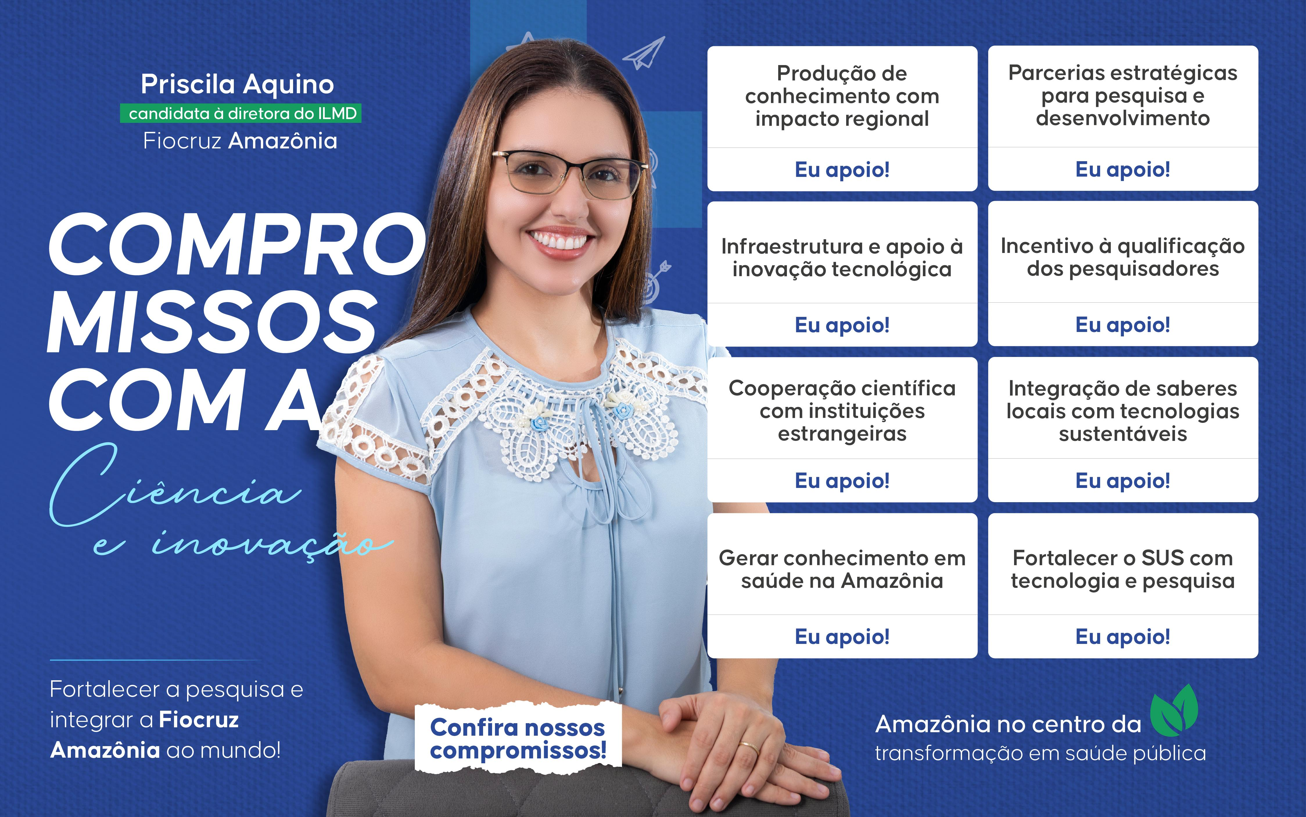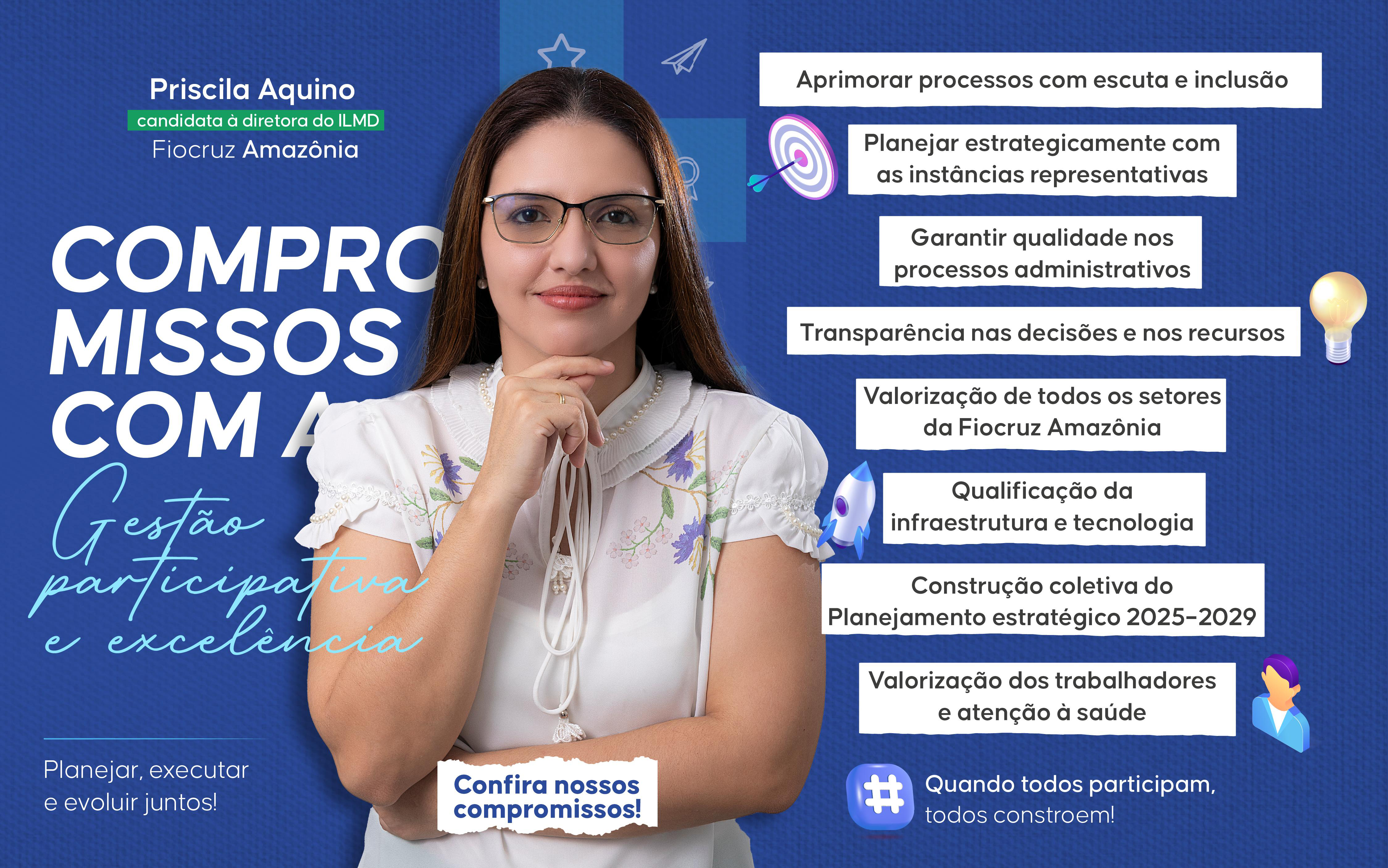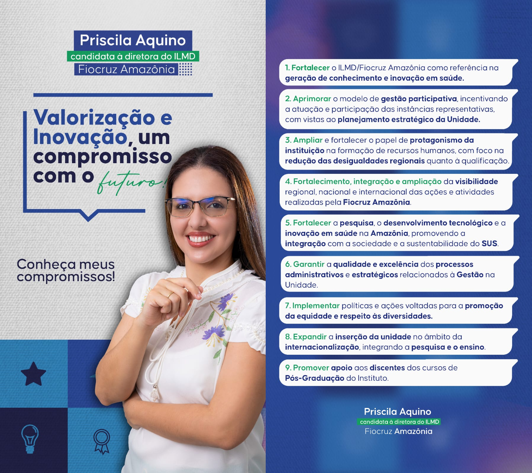 Coordenou o Programa de Iniciação Científica por quatro anos, assim como esteve à frente da implementação e do primeiro ano de atividades do Programa de Vocação Científica. Mais recentemente, desde 2022, assumiu a coordenação do Programa de Pós-Graduação em Biologia da Interação Patógeno-Hospedeiro (PPGBIO-Interação). Em 2025, Priscila Aquino aceitou um novo e importante desafio: apresentar sua candidatura à Direção do ILMD para o quadriênio 2025-2029. Seu principal objetivo é fortalecer a Fiocruz Amazônia, promovendo a valorização de seus servidores e da comunidade que compõe a unidade, com um compromisso sólido com o futuro. A proposta de gestão de Priscila visa consolidar o Instituto como um protagonista regional e nacional na geração de conhecimento e inovação em saúde, impactando positivamente as condições de vida das populações amazônicas. Para alcançar essa meta, pretende integrar de forma estratégica e eficaz as áreas de pesquisa, gestão, educação, extensão e ações de saúde pública, com foco no desenvolvimento sustentável e no bem-estar das comunidades da região.